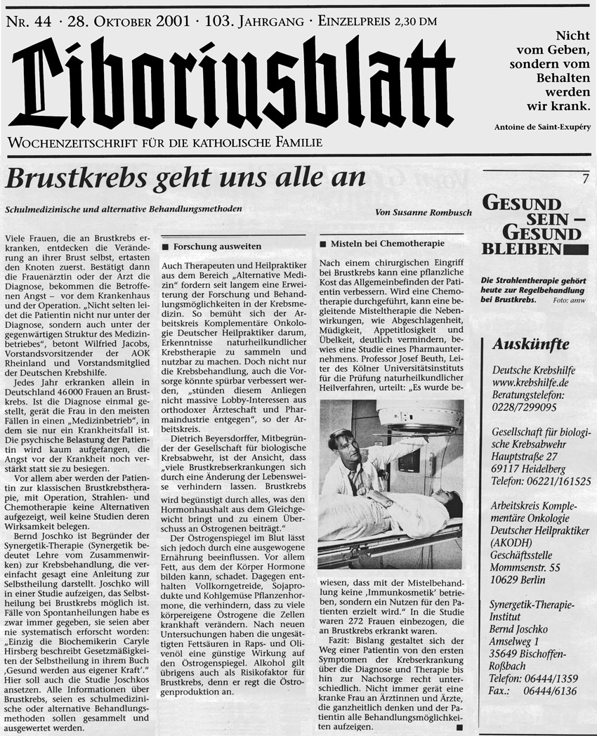 Liboriusblatt 2001: Wochenblatt für die katholische Familie - Synergetik Institut - 28. Okt. 2001: Brustkrebs geht uns alle an Klientenaussagen über die Synergetik Therapie bei Brustkrebs Ist Brustkrebs Schicksal - Brustkrebsstudie von Bernd Joschko Wer krank ist, kann sich auch wieder gesund machen von Bernd Joschko |